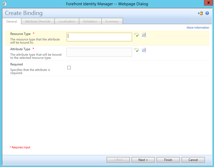 Verify that both Resource Type and Attribute Type have been populated with a value and have been underlined which shows that they have been verified. You will notice an option for Required which you can mark as True if you wanted this attribute to be required for the resource that it is bound to. In this example we will leave unchecked.