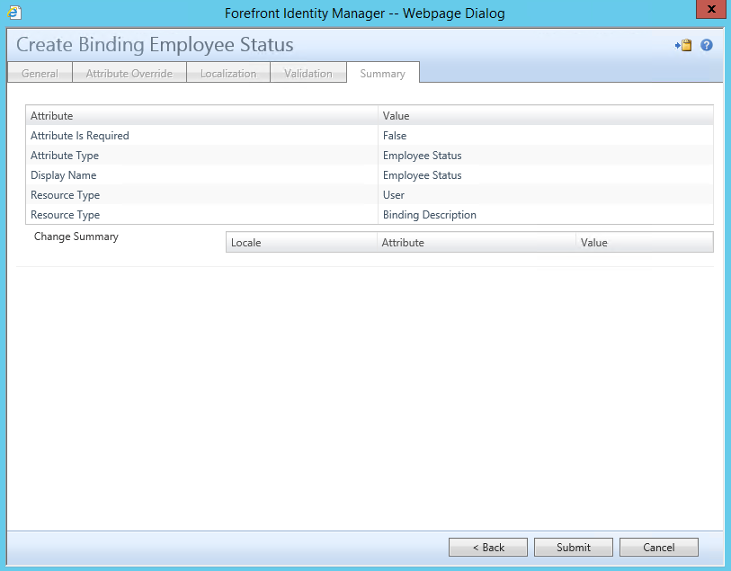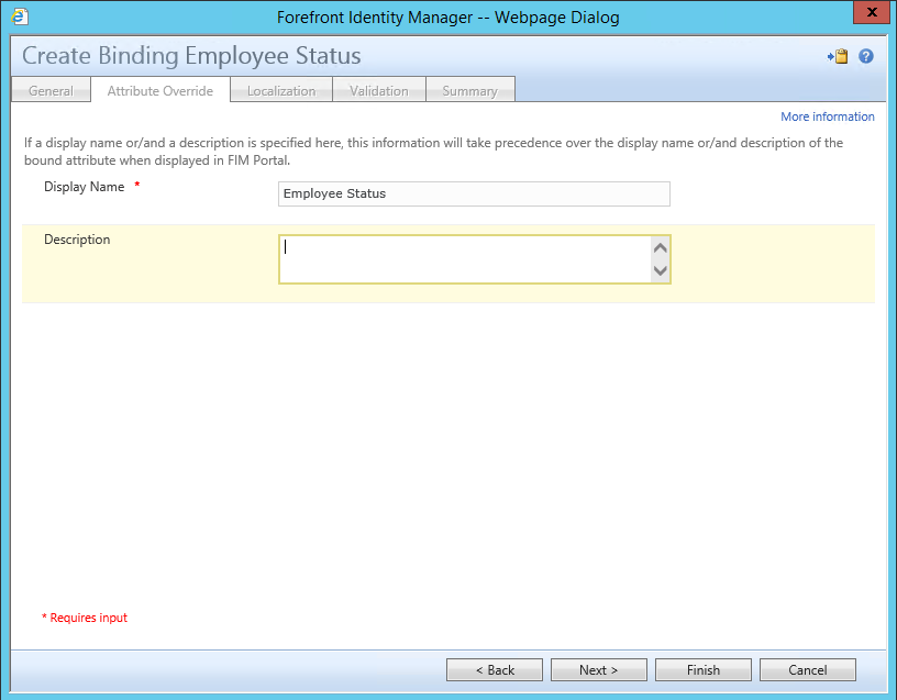 Click on Next to continue to continue to the Attribute Override Page which can be used to modify the Display name of the attribute as it is displayed for the particular Resource that it is bound to. For instance if you wanted to change the display name of an attribute that was bound to both User and Group Resources but only change the Display Name of the attribute for the User Resource and leave the Display Name for the Group Resource you could change the Display Name at the Binding on this page.
