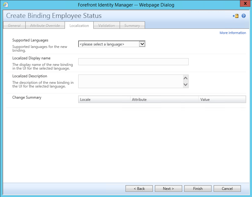 Additionally there is an Option to add a statement or "Description" of the Bound Attribute in the Description Section. For this example you can just click on Next to continue to the Localization Page.