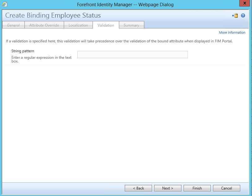 On the Validation Page much like the Validation Page you see when creating the attribute within the FIM Portal Schema Management the Validation Page allows you to add a Regular Expression which can be used to control accepted