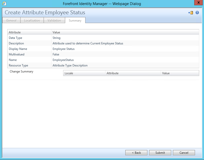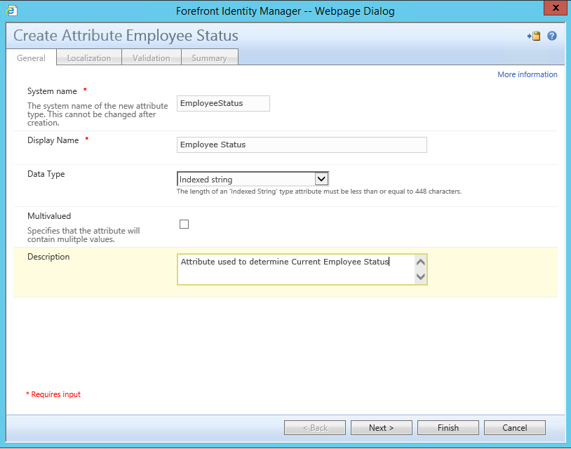 After you verified that the information is correct click on Next, you will be presented with the Localization Page that gives you an option to configure this attribute for additional language support.