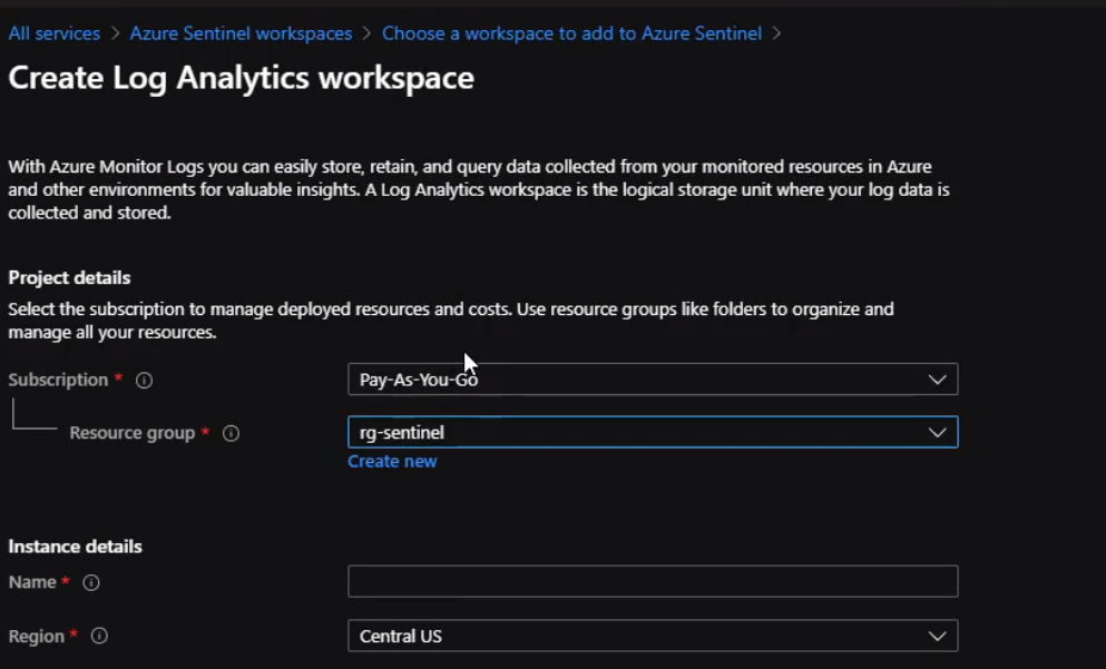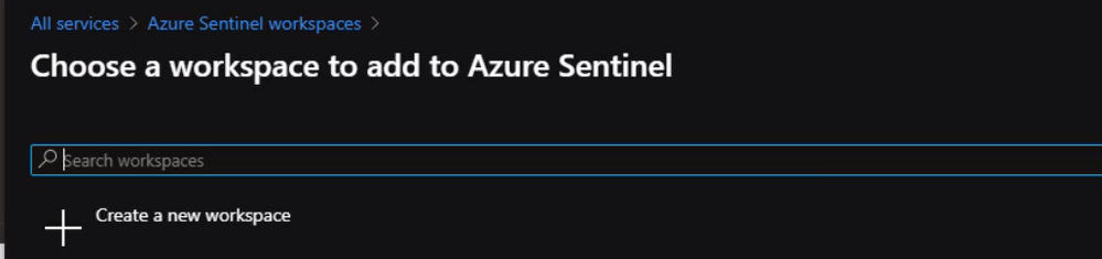 Now, we will give the workspace name and select a region that is suitable for Our resources. Once our workspace is ready then We can click add Azure Sentinel