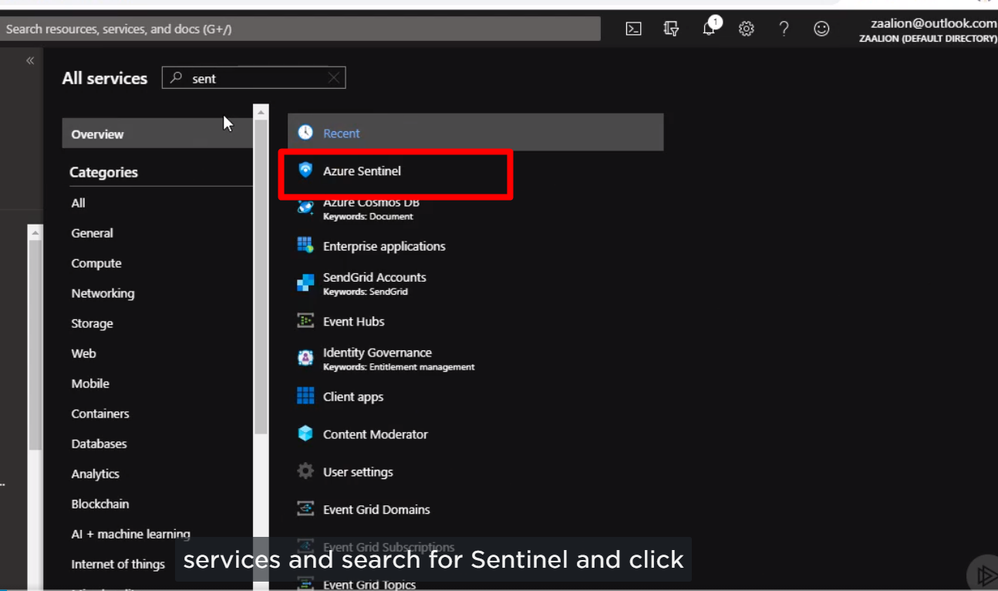 We can select all services, search for Sentinel, and click on Azure Sentinel.