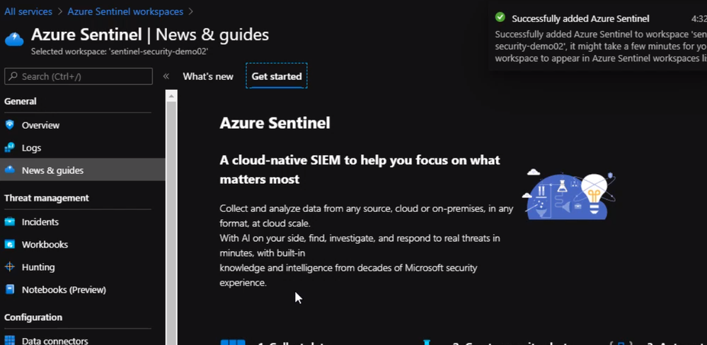 our Azure sentinel workspace is created. So now we can go ahead and configure a few Azure resources to send logs to this workspace.