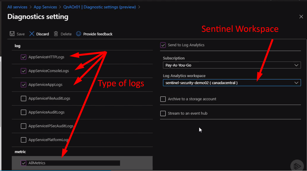 From the Diagnostics setting, we can select a different type of logs to send to Sentinel workspace as following