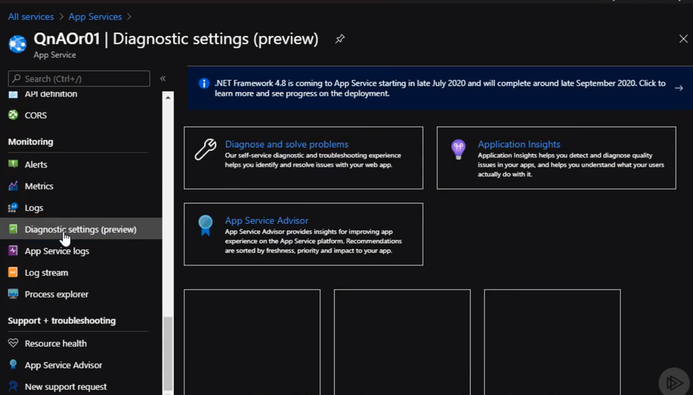 We will start with apps services. From the portal page for the app services, we can scroll down under monitoring, click on diagnostic settings, click on add diagnostic settings.