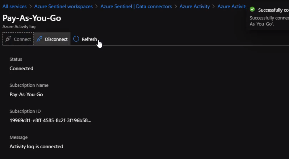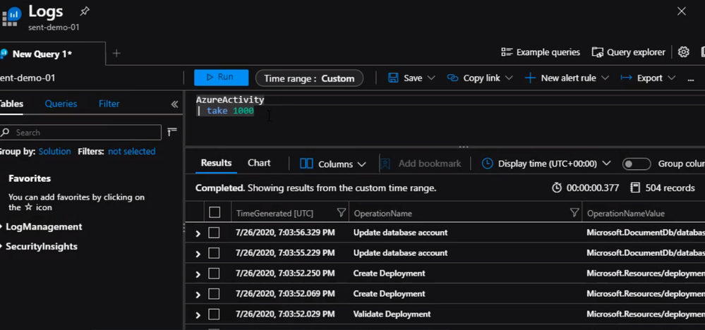 Now, We are connected and Azure sentinel instance can now ingest Azure activity logs. We can check Activity Logs by running a simple query to make sure we are receiving logs