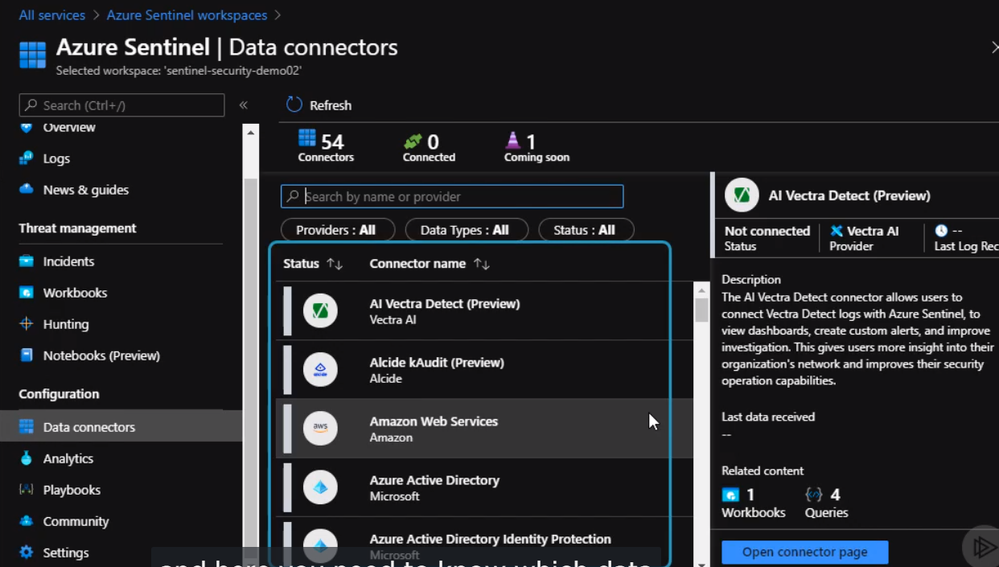 In this section, we will explain how to configure Azure Sentinel to respond to incidents and security violations. First, we need to connect Azure Sentinel to a data source by clicking on data connectors, it will show us a list of data sources.