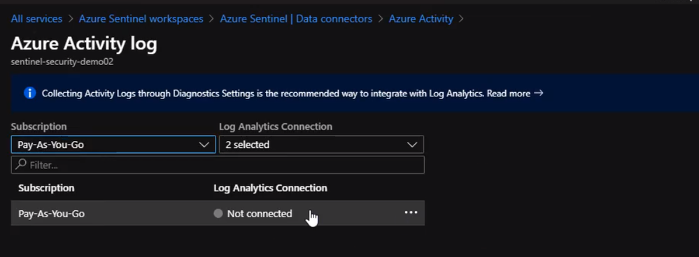 Then we select the subscription and click Log Analytics Connection