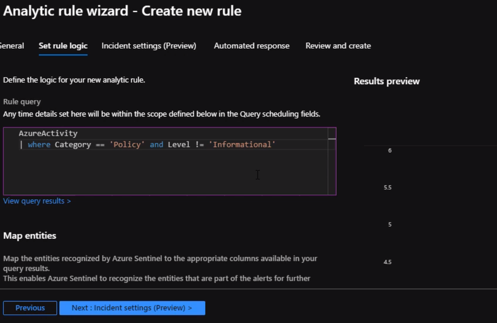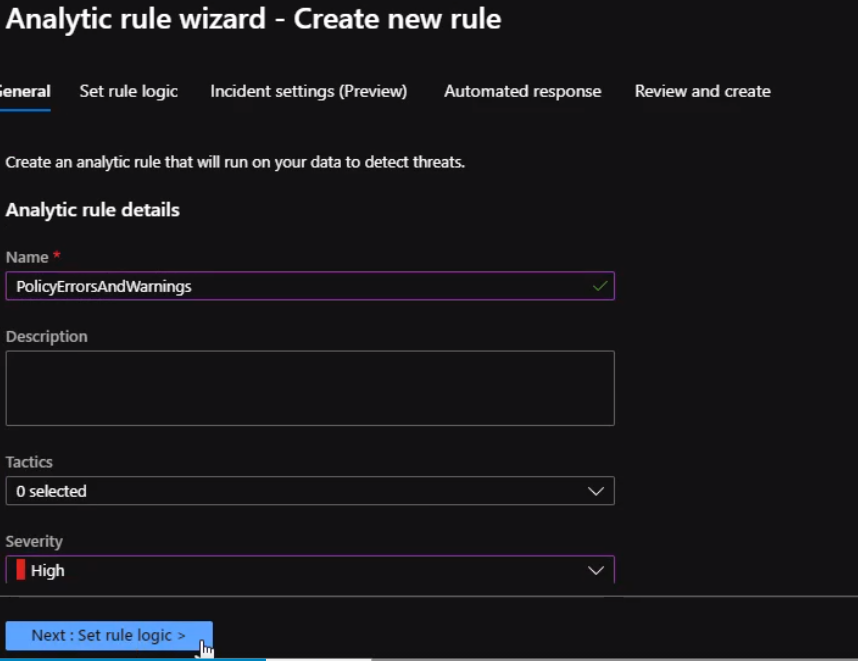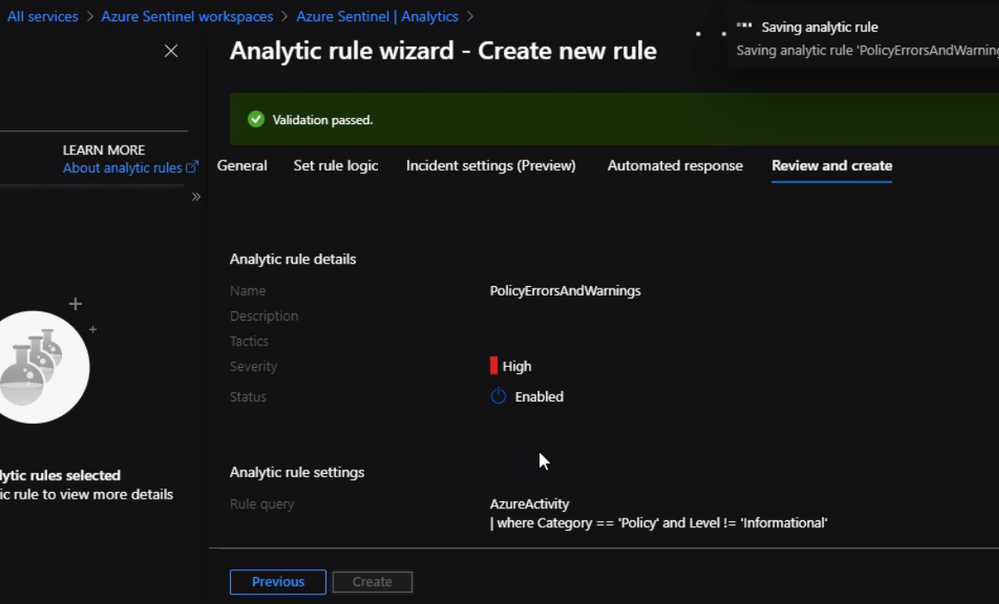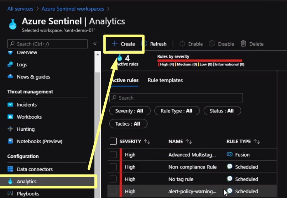 Once we verify the query is working properly, we can start setting the alert. From Sentinel blade click on Analytics and click on “Create” to establish a new rule