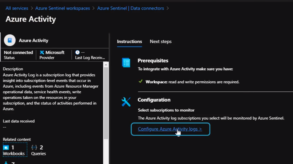 We will configure Azure Sentinel to detect and respond to policy violations in our subscription. In this case, we will need to select Azure Activity as our data connector and click “Configure Azure Activity Logs”