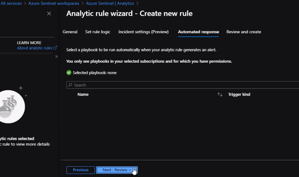 After filling the schedule, we can click on Incident settings where we need to specify how we want Azure Sentinel to respond to the incident. If we do not have a playbook set up yet we can just click “Review” and create the alert