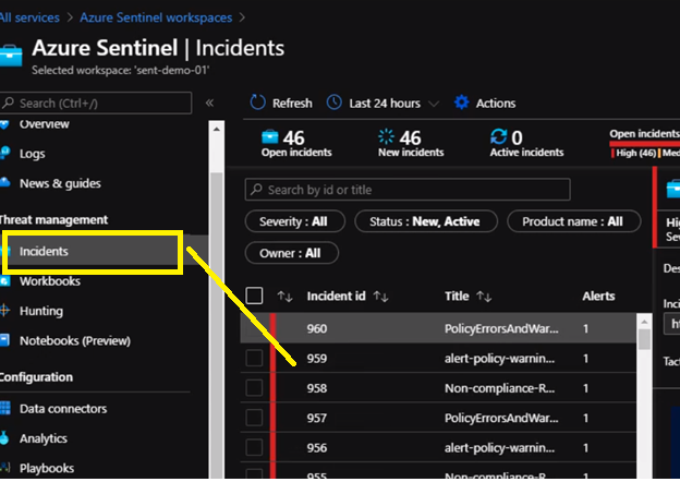 Then click Review and save. Now if any resource will violate the policy in place we will be notified from Azure Sentinel. Also, we can check Incidents Review to check all the violation and incident As we can see it is extremely easy to use Azure Sentinel to respond to security events threatening the health of our subscription