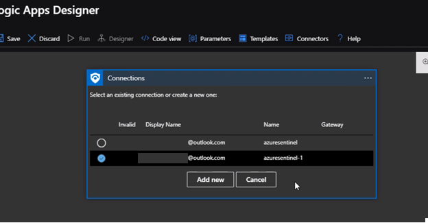 Next will select the connection to connect to the Azure Sentinel Workspace instance