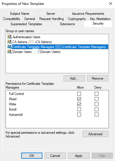You should also have a dedicated group for template management (i.e., CA Template Managers) with Write permissions configured to allow for management of all of the templates in your PKI, and these should be limited to only this purpose to maintain control of your templates.