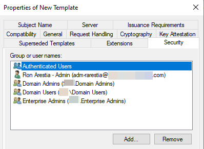 There are three ACEs in every ACL that should either be removed or changed: Domain Admins, Enterprise Admins, and an ACE created for you or the user who created the template. Remember in any conversation around Active Directory or ACLs in general, individual user attribution should be avoided at all costs. AD is a group-based identity solution, and ADCS is no different. Remove yourself or the user who created the template, as those rights should be given through membership in an appropriate group. It also helps prevent ugly unresolved SIDs later in the life of the CA.