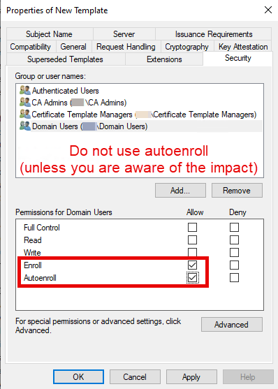 I can’t express enough how important it is to NOT use Autoenrollment on widely scoped templates. There are very few real-world use cases where autoenrollment is useful for the majority of enterprises. The most notable exception would be 802.1x certificates where a machine must have a certificate to get on your network. In this case, certificate mapping is one-to-one. Certificates should be issued purposefully and with limited scope. For example, do you really want every service account in your AD environment to grab a user certificate for Email Encryption? Or worse: Encrypting File System (EFS)? Do your Domain Admins really need any certificates outside of maybe smart cards? Are you certain all Domain Computers need a Server Authentication EKU certificate? Are you allowing user endpoints to host services that require it?
