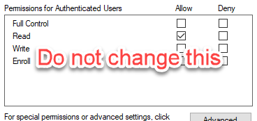 Every single template will have Authenticated Users configured with Read permissions. Do not change this! This ACE allows all authenticated users (and computers) in the domain to list the template for use. NEVER configure this ACE alone. Again: do not change the Authenticated Users ACE on ANY template!