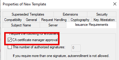 If you do NOT enable manager approval, anyone with the rights to request the certificate can have a certificate issued for anything they desire, and since these templates often also allow for the private key to be exported, you could wind up with rogue servers or websites being setup with no administrative oversight. This could happen by accident or, if a malicious user or threat actor gets access to your environment, they could generate certificates for their own purposes. I’ve seen instances where a threat actor created a Code Signing certificate from a misconfigured template, signed their malware, distributed it, and no one in the organization was any wiser, because that code was trusted by every system in the organization.