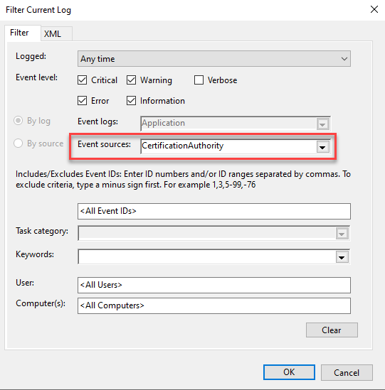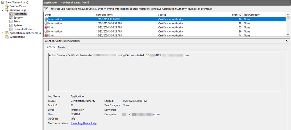 Once properly configured in both the ADCS server properties and security policy, relevant events will start to flow into the Application event logs with a CertificationAuthority source.