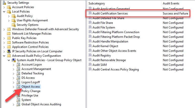 Note on policy subcategories: Years ago, Microsoft added the ability to configure granular auditing with a new setting “Audit: Force audit policy subcategory settings” which then allows you to get deeper audit results from the operating system than with the traditional event logs. This is required to get your ADCS logs into the proper event logs in Windows.