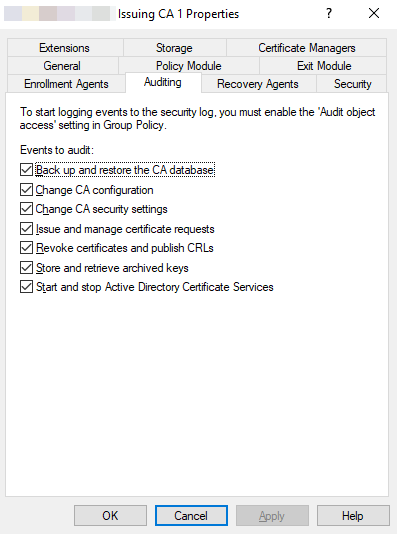 First, acclimate yourself with the ADCS server management console (certsrv.msc). This is your one-stop-GUI-shop for managing your CA. There’s an auditing tab where you can configure all of the events captured by the event logging subsystem.
