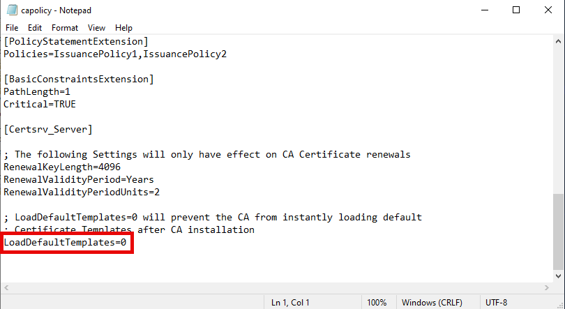 When you spin up your very first enterprise CA, the Domain Controller certificate template is automatically configured for issuance. To prevent this, make use of the CAPolicy.inf configuration to prevent the default templates from being published on a new CA: