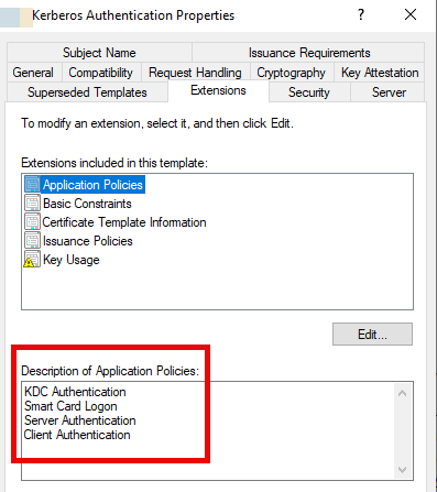 Finally, to ensure consistency with Kerberos authentication, issue a template with the KDC Authentication EKU. Managing this centrally with ADCS is a great way to standardize your cryptographic health.