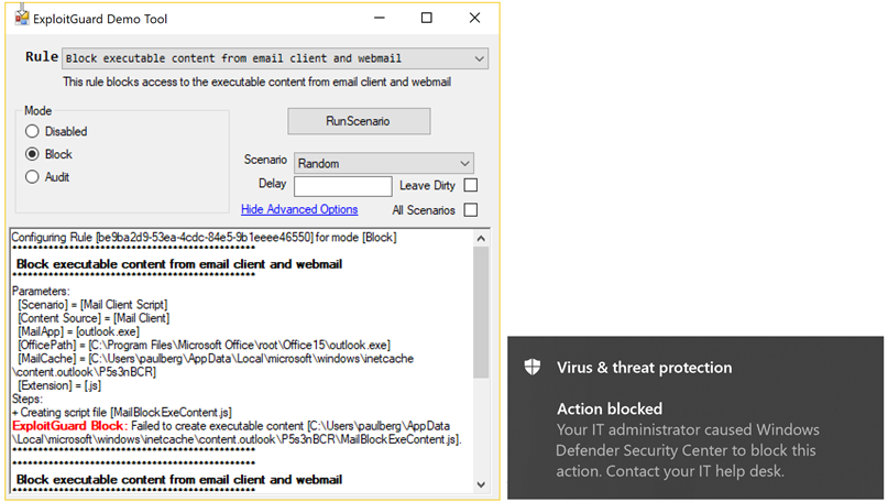 To manage ASR rules from PowerShell each rule (ID) above is assigned a GUID that is used to "Enable" or "Audit" the rule. Example, auditing can be enabled as follows: Add-MpPreference -AttackSurfaceReductionRules_Ids -AttackSurfaceReductionRules_Actions AuditMode Microsoft has provided a tool to help engineers evaluate how "Attack Surface Reduction" rules work. *8 The tool allows the engineer to initiate various actions that would trigger the protection of the system. The tests can be configured for either "Block" or "Audit" mode.