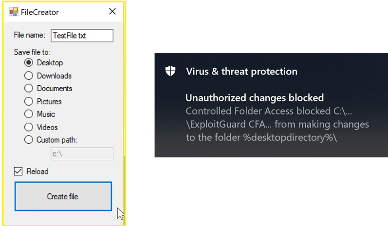 Ransomware has become one of the biggest security threats facing our customers today. Attackers attempt to encrypt your user's data and won't provide the decrypt key without being paid a ransom with a cryptocurrency. Controlled Folder Access (CFA) which is a part of WDEG can block applications from updating pre-defined folders. Enabling CFA can be managed locally, configuring locally requires the user to manage the settings within Windows Defender Security Center. The folder and application configuration settings can also be managed by your desktop administrator with Group Policy. *9 Prior to rolling out CFA, Microsoft has created a demo tool that allows the administrator to trial the impact of an application that has not been granted permission to update an authorized location. The tool "FileCreator" attempted to update a folder that generated the error as seen below. This error is what users would see if this protective feature was enabled. *10 CFA also provides the ability to audit impact prior to enabling this feature, thereby providing the administrator the ability to find any application compatibility issues. *10
