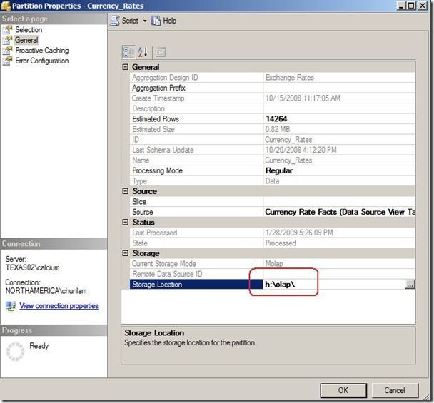 In 2005 and 2008, SQL Server Analysis Services allows users to store partition data in a non-default location. That is something we could not do in 2000 version. To store a partition data in a non-default location means that you can have the partition storage location set to some folder other than the default data folder (see the screen shot below). Some users choose to use the feature because it can off load some IO to different drives. It helps balancing IO activities. Others choose to use it simply because they don’t have enough disk space in the default location.