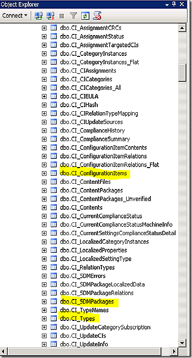 In the database the CI’s and SDM Package components are all contained in tables beginning with CI_. I won’t attempt to go through every one of these tables but will take a look at the highlighted ones to help our understanding of CI’s and SDM Packages. Before we go further, a disclaimer. What I am about to show in the database is for education purposes only. There is nothing here that you should ever attempt to change. I’ve never had to make any changes here and if attempted these changes likely would corrupt your database entries – so don’t try it!