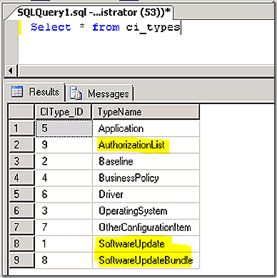 I’ve mentioned already that while our focus is software updates that the concepts discussed here apply to any component that makes use of CI’s and SDM packages – and I’ve already listed those components. You can also see this in the CI_Types table. We see that our software updates are represented by a CIType_ID of 1, 8 or 9. This may vary from database to database so always check this table to know for sure before digging deeper into tables. You will also notice CITypes listed here from other components – type 2, 3, 4 and 5 are for DCM, type 6 is for OSD and type 7 is generic.