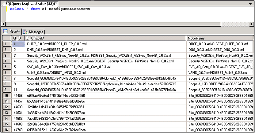 OK, on we go. In the database there are many tables that are used to describe categories of data – such as the discovery tables, the hardware inventory tables and, in our case, the CI tables. In general, each group of tables will have one master location where data is stored and then several other tables that further describe the data and relate back to the master table (thus the very concept of a relational database!). For CI’s the master table is CI_ConfigurationItems. This is a very large table and the bulk of the content that is found here will be software updates – but will also include DCM data, OSD data, etc. In the snip below CI_ID 44456-44749 all represent software updates – you can tell by looking at the CI_UniqueID column. CI_ID entries 1-11 represent DCM CI’s – again, see the different format in CI_UniqueID. Looking further at the CI_UniqueID we can see CI_ID 3 and 4 are security CI’s, 9 is an application CI and 7, 11 are cloned CI’s meaning they were copied from another CI source in the console.
