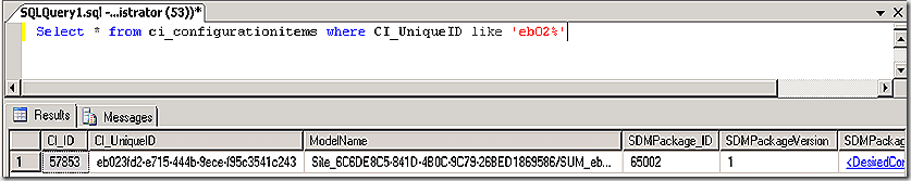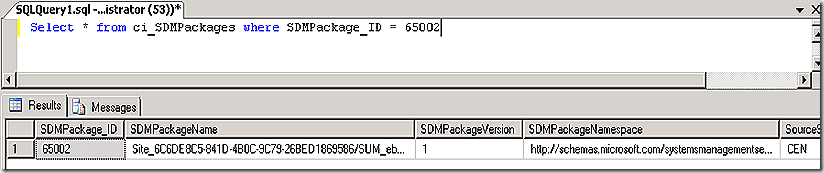 We will stop there for the CI itself – lets examine the full SDM package. The following query pulls out the specific SDM package associated with my CI. From the initial results we can see that the SDM Package refers back to our update (take a look at the end of SDMPackageName)