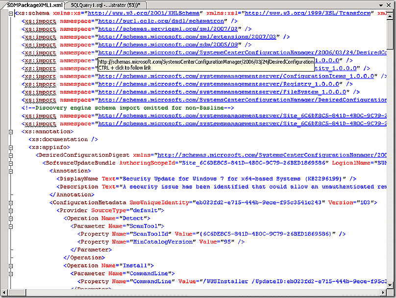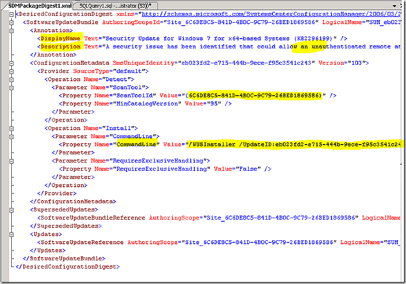 OK, so if we click on the SDMPackageDigest entry we will see a new screen open with details of our update and how to implement the configuration on our clients. Remember, this is just the Digest – there is a ton more that is not revealed here. We see the DisplayName for the update and Description defined here. We also see that in order to scan for this update we need to use the highlighted scan tool (6C6DE…). If you review part I of this post you will see the request for this scan tool reflected in the logs. We also see the command line that will be used to install the update. Have you ever noticed that in ConfigMgr you cannot enter the command line for update install? You could do so in SMS 2003 ITMU but not ConfigMgr. That doesn’t mean the command line isn’t stored and executed – it clearly is here – just that you can’t change it. The only options for modifying update application are the options selectable in the console.