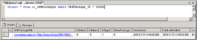 When attempting to query this table you can get lost unless you know what you are looking for. In the next query I am specifically pulling out the CI representing our software update discussed in Part I of this series. The result set displayed tells us a ton – we can see the CI_UniqueID maps exactly to the Unique Update ID we traced in part I of this series. We also see in the modelname column that the portion after the / – SUM_eb confirms also that this is a software update management (SUM) CI model and also corresponds to our unique update id (see the eb portion just at the end of model name – if you expand this column all the way you will see the rest of the string is exactly the CI_UniqueID). We also learn that the SDMPackage that our CI is linked to is 65002 – we will take a look at that in just a second but notice at the far right we have the SDMPackageDigest column. This is a truncated representation of what we will see when we look at the specific SDM entry shortly.