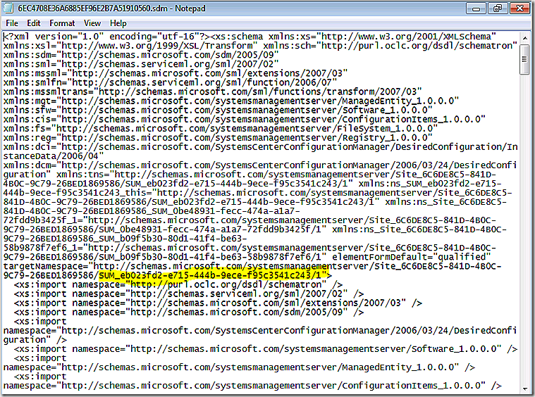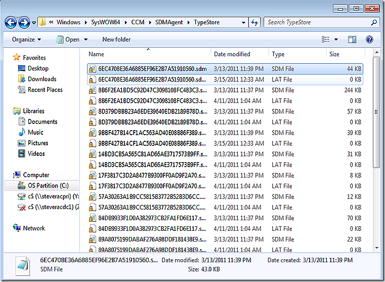 OK – so does the information shown here simply remain in the database? No – if it did there would be no instructions for the client to use when asked to install or deal with these CI’s. In part I of this discussion I walk through the logs and show how there are three components that need to be downloaded for an update – the CI, the SDM package and the update itself. The CI is downloaded and stored in WMI on the client and the update itself is stored in the client cache – again, illustrated in part I of this discussion. The SDM package definitions are downloaded to tye SDMAgent\TypeStore folder on a client as shown. Notice that for every GUID there is a .SDM extension and a .LAT extension. The .SDM file contains the definition from the database and the .LAT file is the Last Access Time for the particular SDM package. This .LAT file is used to determine when the .SDM package has aged out of the systems sufficiently to warrant being deleted. This is not something you should ever have to touch but just an FYI. Also note that the specific software update GUID is not seen in the list of files – which makes finding the specific .SDM package a bit of a challenge here. You can find it though – in my case it happens to be the .SDM file at the top.