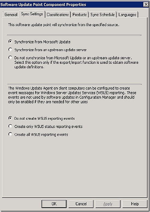 We will start our discussion at the point where everything has been installed already. If we then look under component configuration in the console we can review our settings for the software update point. The setting we care about for this discussion are on the ‘sync settings’ tab.