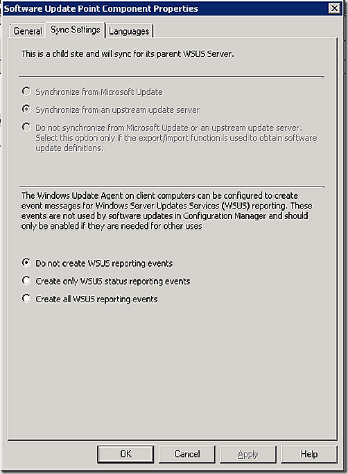 If we take a look at the ‘sync settings’ tab on a child site we see that the options are all grey and the sync choice is set to option 2 – which simply means that the site will make use of the immediate upstream WSUS server (software update point) for it’s synchronization needs.