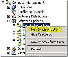 Another way to start synchronization is to navigate to the software updates node, choose Update Repository > Run Synchronization. A warning will be displayed that this could take a while – select past the warning and the sync process will start. Note that just like you cannot set a sync schedule at a child site you also cannot run a manual synchronization anywhere but at the central.
