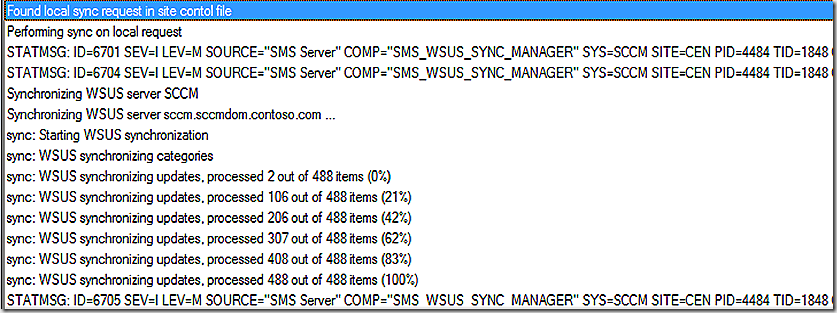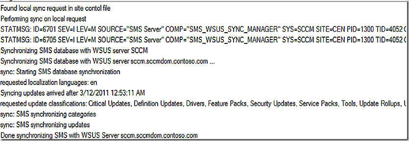 Lets take a look at the WSYNCMGR.LOG and see this in action. The first and second line of the log shows that this is a manual sync request. At line 5 we see that we are starting to synchronize the WSUS server – the name of that server happens to be SCCM – this is made more clear in line 6. The first thing that we need to sync on line 7 is the categories – to see if any additional categories have been added at the Microsoft Updates server. From there we start to synchronize the updates – we see there are 488 of them to pull down. Note that we don’t sync all updates unless every update category is selected under component configuration. We finally finish update sync from the Microsoft Updates Server and log a status message.