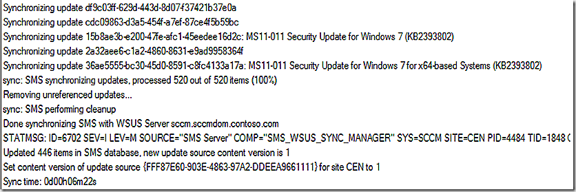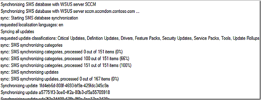 Step 2 of the sync process then starts. Line 1 shows that the SMS database is now being synchronized with the WSUS server. This is specifically called out on line 3. We first make sure all update categories are copied over and then start to synchronize the updates themselves. The update sync process has started in the last two lines of the log snip – for this sync we just have 167 updates to pull over so it shouldn’t take long. Note that the updates are referenced by their unique update ID. In some cases you will also see the update name and KB.