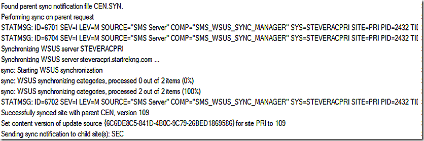 The following snip is from a primary site that has been requested to synchronize by it’s parent. Note that there is no need to sync from Microsoft Updates so we just go immediately into the process of pulling updates down into the ConfigMgr database. We also see at the end of the snip that the sync request is being sent down further to the secondary site - which is a child of the primary – to request it sync from the primary.