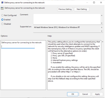 - HKLM\Software\Policies\Microsoft\Windows Defender\ProxyServer