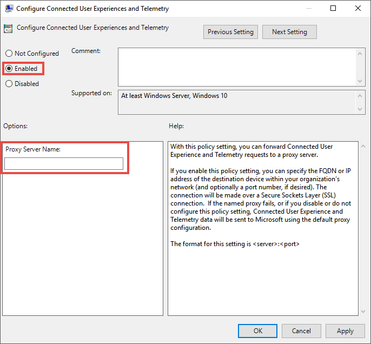 Overview of group policy settings showing the proxy configurationAnd at Administrative Templates > Windows Components > Data Collection and Preview Builds > Configure connected user experiences and telemetry