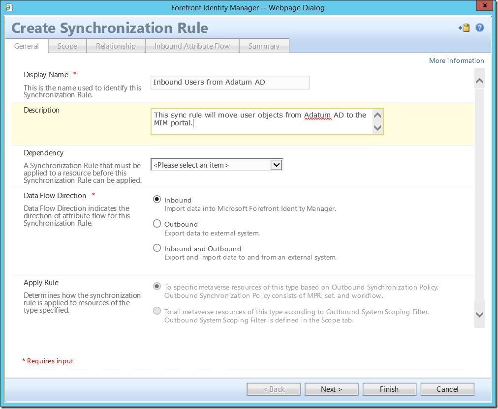 This will open the “Create Synchronization Rule” dialogue. Enter a  Display Name  and (optionally) a  Description  . Select a  Data Flow Direction  (in this case, “Inbound”), and click “Next” to continue.