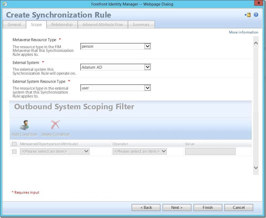 Now we must scope this SR to an object class and data source. For  Metaverse Resource Type  , select “person”. Under  External System  select the Active Directory you wish to connect to. *NOTE: If this were, for example, a SQLMA, we would instead select SQL from the drop down menu.* Under  External System Resource Type  , select “user”. Please note, while there are “Inbound System Scoping Filters”, the use case is less common and not covered in this scenario. Click “Next” to continue.