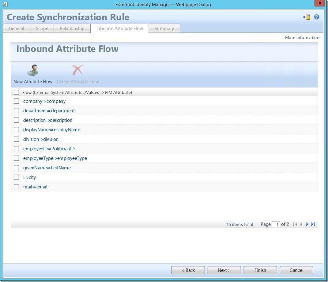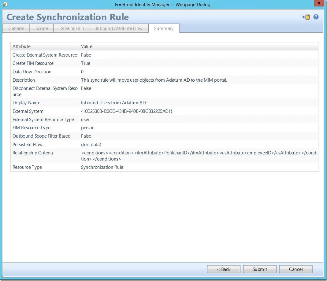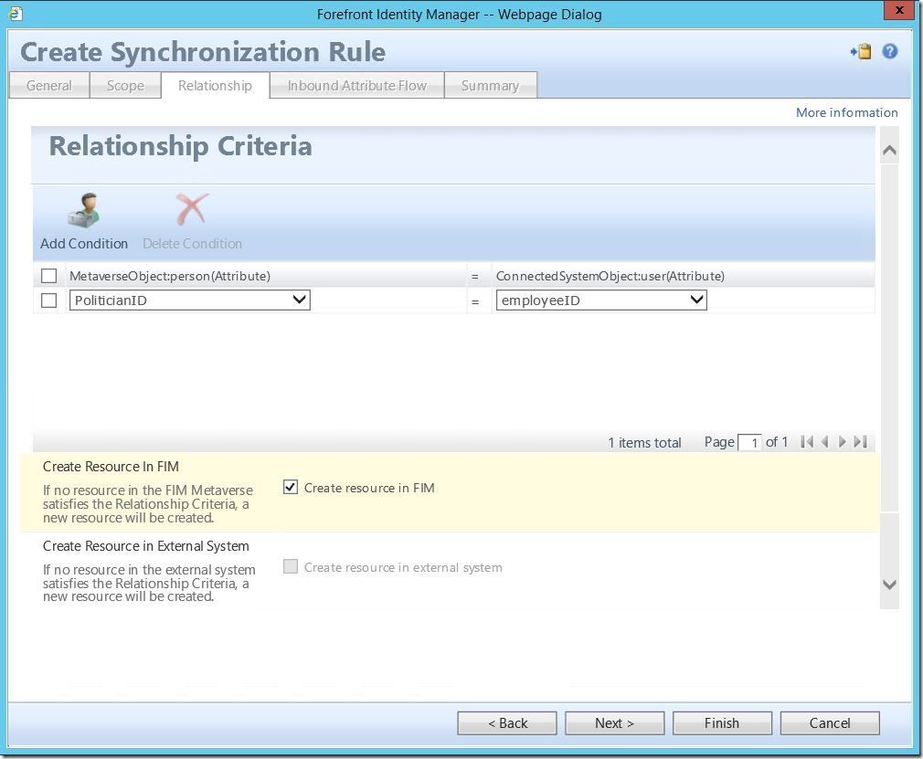 Under “Relationship Criteria”, we must define a relationship mapping. This will be, ideally, a globally unique value mapped for the purpose of effecting joins. In my lab, I am using a custom attribute (PoliticianID) mapped to employeeID. Also, please note, if you would like these users to actually be created in the MIM portal if they do not already exist, you MUST select  Create Resource in FIM  . Failure to select this checkbox will result in a new user from AD not being created in the portal and also not giving an error. After all, you didn’t tell it to create the user, so it didn’t. This is easily missed and can be mildly infuriating.