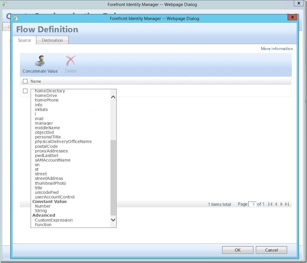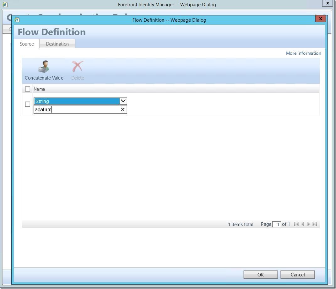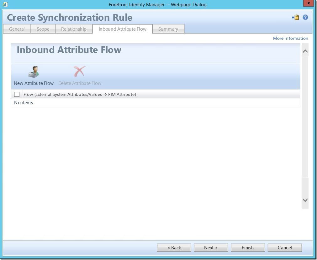 Next, we must define some attribute flows. In a code driven, sync only solution, these flows would have been created directly on the ADMA under the “Configure Attribute Flow” tab. Now, in an SR based solution, we simply move those flows here. Click  New Attribute Flow  and select your data source object. Next, click on the  Destination  tab and select the data target attribute, then click  OK  .